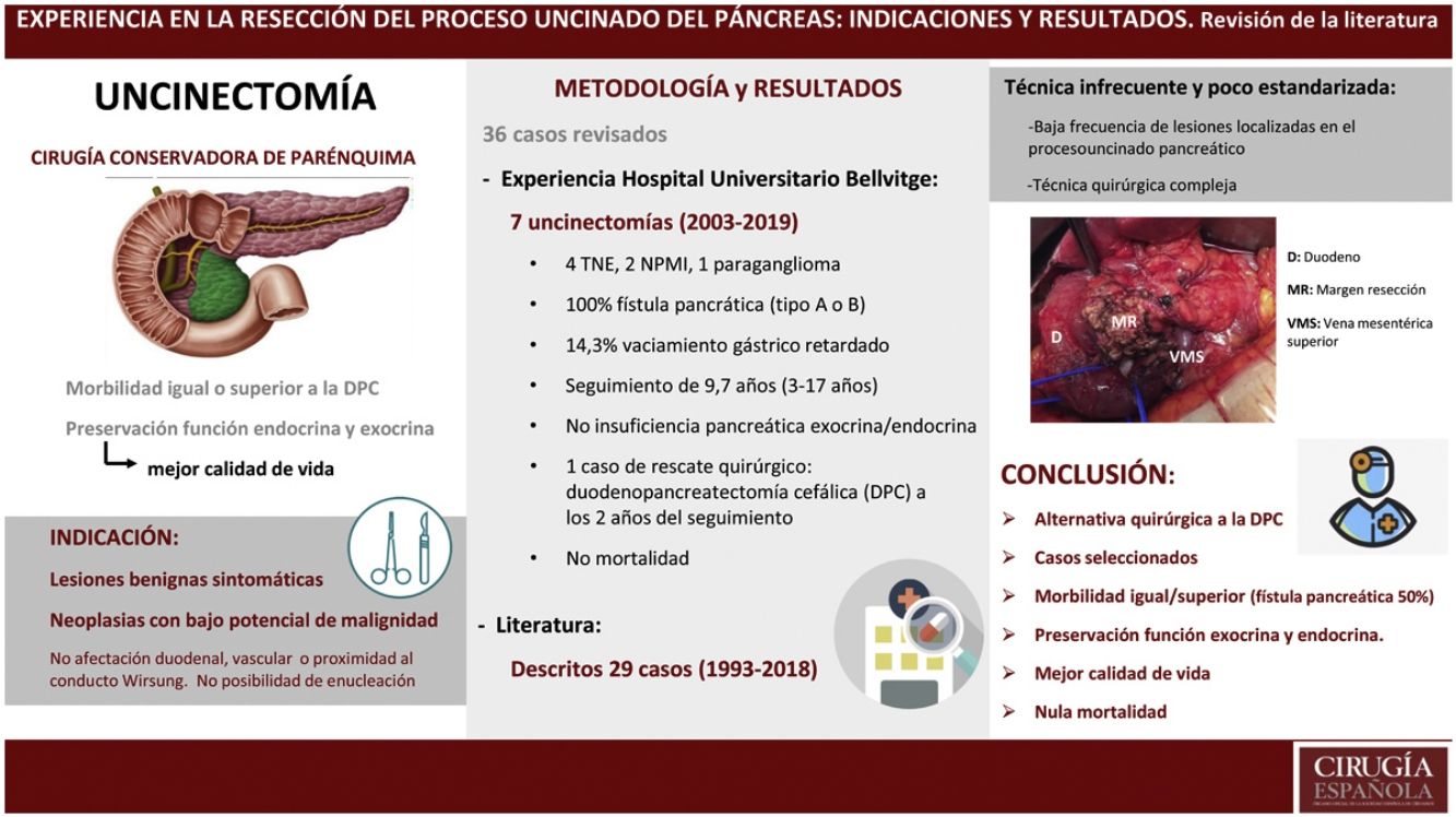 ConclusiónLa UC es una técnica infrecuente y poco estandarizada para la resección de lesiones benignas o de bajo potencial de malignidad localizadas en el proceso uncinado del páncreas. Aunque se asocia a una morbilidad igual o superior a las técnicas de resección estandarizadas, ofrece una preservación excelente de la función endocrina y exocrina pancreática, con el consiguiente beneficio en la calidad de vida de los pacientes a largo plazo.