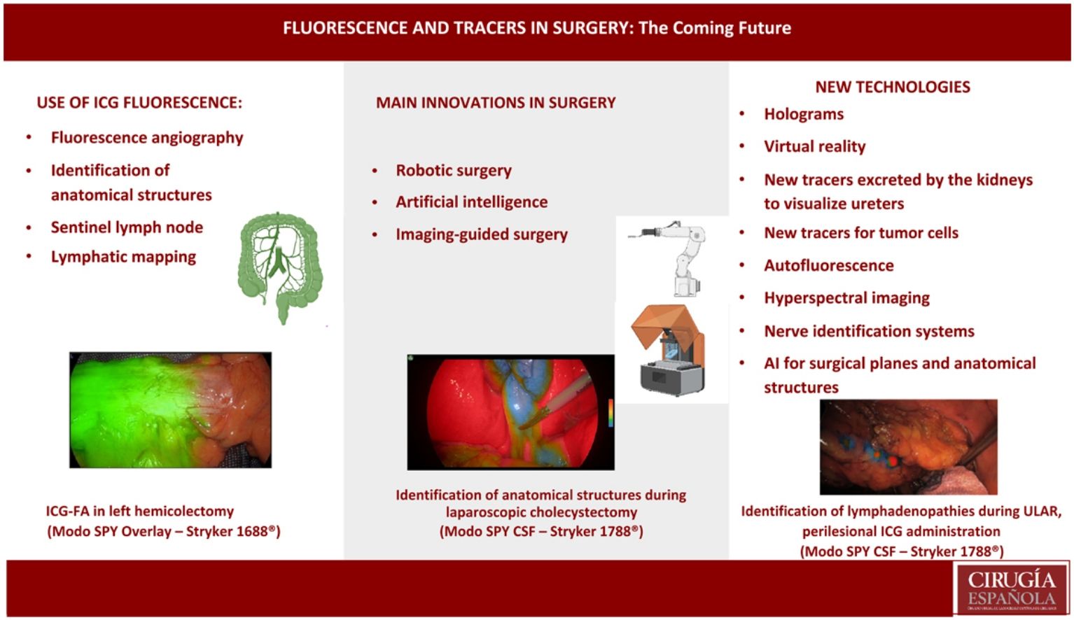 Indocyanine green (ICG) has been used to identify different anatomical structures, assess tissue perfusion, identify lymphatic drainage of different tumors, and even to identify tumors themselves. But most importantly, this technology has come hand in hand with the potential development of other tracers, which will facilitate the identification of tumor cells and ureters, using different beams of light to identify anatomical structures, while also leading to other types of systems to assess tissue oxygenation without the use of tracers, such as hyperspectral images. Without a doubt, the scope of possibilities that accompany the expansion of the concept, and the imminent improvements in its use (such as quantification), will represent a turning point in our current notion of the operating room and surgical procedures, which is a real revolution in the world of surgery.
