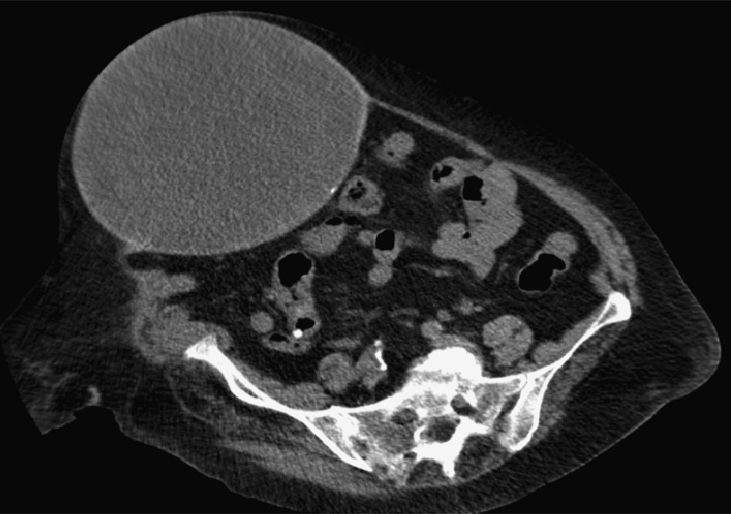 A 79-year-old woman was referred to our department due to an abdominal wall tumor (Fig. 1). Her medical history included midline laparotomy in 1982 and strangulated incisional hernia repair (with polytetrafluoroethylene prosthesis) in 2006. Computed tomography showed a cyst measuring 31cm×19cm×17cm on the right rectus abdominis muscle (Figs. 2 and 3). The lesion was completely resected, with primary closure of the defect and placement of polypropylene mesh. The pathology study showed evidence of granulation tissue with chronic inflammation (anterior wall), granulomatous reaction to a foreign body, fibrosis (posterior wall) and no malignancy. Pseudocyst is defined as a collection of fluid that is not covered by epithelium. There have been other denominations such as chronic seroma cyst and giant fibrous cyst, but the histology confirms the pseudocyst.