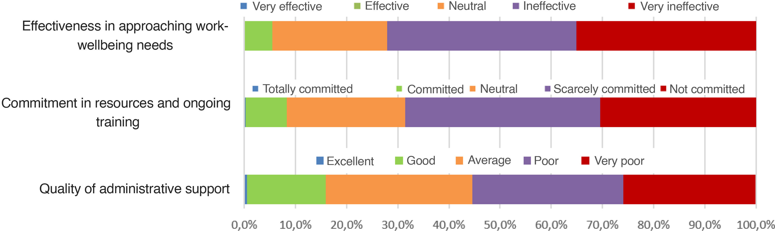 325 cirujanos participaron en la encuesta. El 57.5% fueron mujeres y el 95.1% trabajadores de hospitales públicos. Se detectó hasta un 21.8% de ansiedad habitual en situaciones diarias y una ausencia de formación en estos aspectos en el 63% de los encuestados. Hasta un 22.8% refirieron solicitar asistencia profesional relacionada con estos aspectos ocasional o frecuentemente. El 48% manifestaron exceder su jornada laboral habitualmente, el 69.9% reportaron dificultades en la capacidad de conciliación laboral y se identificó una notable percepción de ausencia de soporte institucional. Esta problemática fue significativamente más acusada entre los cirujanos jóvenes y en mujeres.