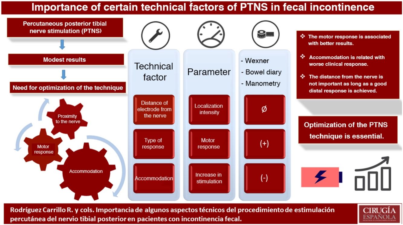 Please cite this article as: Rodríguez Carrillo R, Ruiz Carmona MD, Alós Company R, Frangi Caregnato A, Alarcón Iranzo M, Solana Bueno A, et al. Importancia de algunos aspectos técnicos del procedimiento de estimulación percutánea del nervio tibial posterior en pacientes con incontinencia fecal. Cir Esp. 2021;99:585–592.