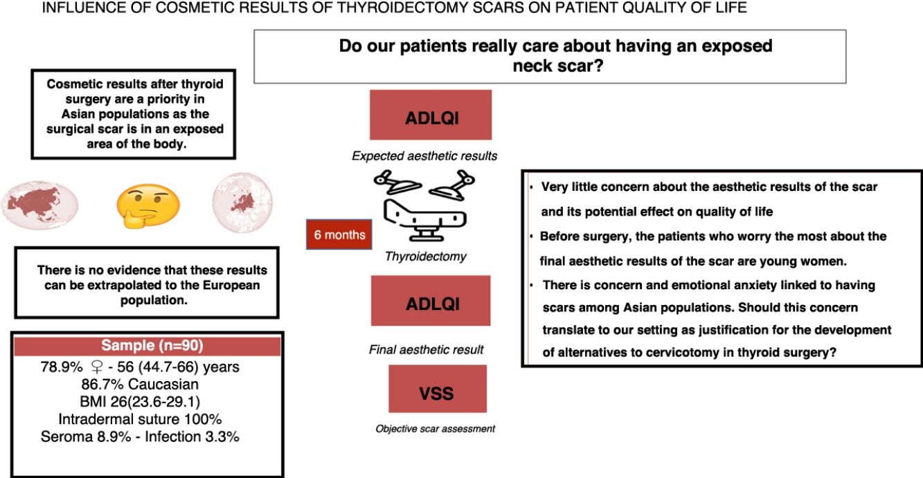 ConclusiónLos pacientes, que van a sufrir una cirugía tiroidea convencional, muestran una limitada preocupación sobre el resultado estético de su cicatriz. Los pacientes más preocupados son mujeres jóvenes. La angustia estética por las cicatrices en poblaciones asiáticas, no parece trasladarse a nuestro medio.