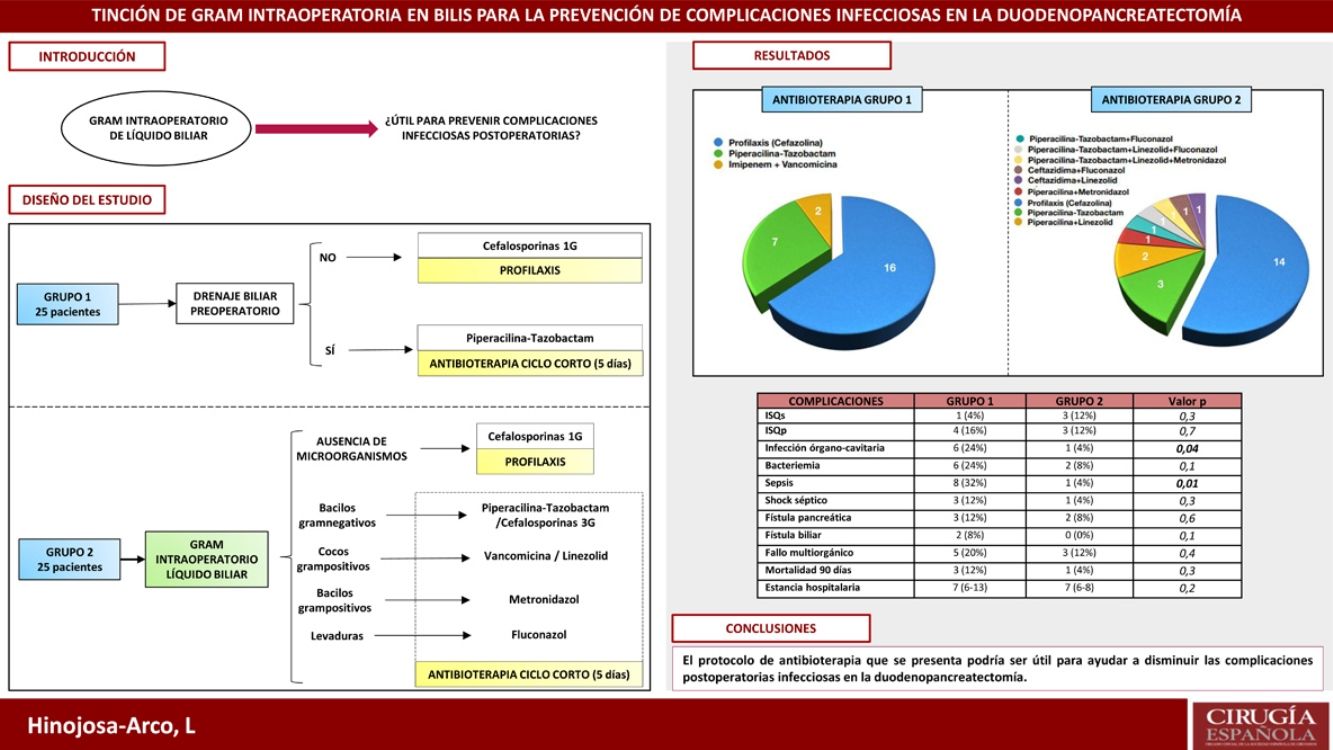 Please cite this article as: Hinojosa Arco LC, Roldán de la Rua JF, Carranque Chaves GÁ, Mora Navas L, de Luna Díaz R, Suárez Muñoz MÁ. Tinción de Gram intraoperatoria en bilis para la prevención de complicaciones infecciosas en la duodenopancreatectomía. Cir Esp. 2022;100:472–480.