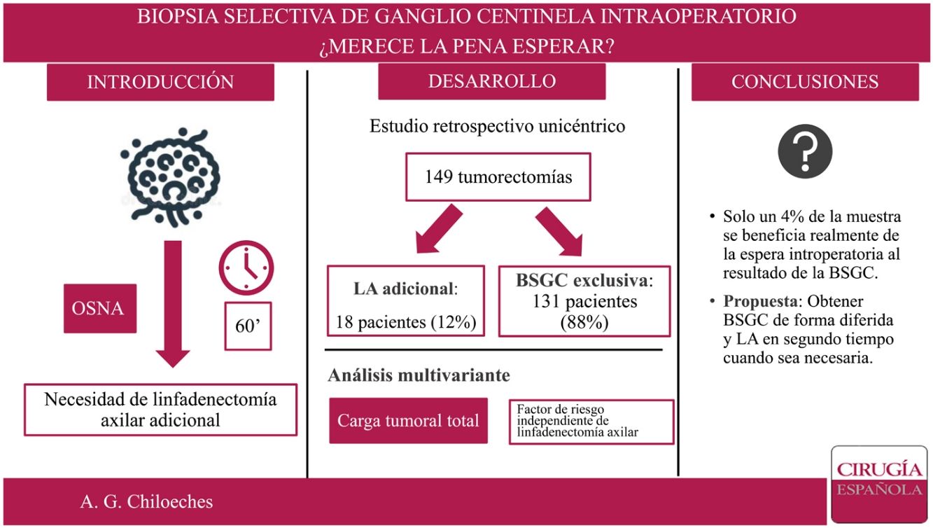 En nuestro centro el estudio de la biopsia selectiva del ganglio centinela (BSGC) se realiza de forma intraoperatoria. El objetivo principal del presente trabajo es conocer qué proporción de pacientes se beneficia de la espera intraoperatoria al resultado de la BSGC.