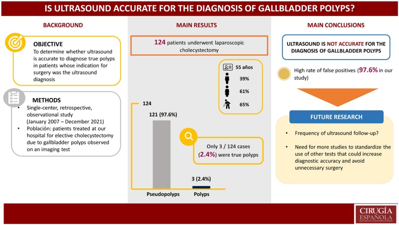 ResultsWe included 124 patients in our study. An elective laparoscopic cholecystectomy was performed in all of them. The mean age was 55,4 years and 61% were women. Of all patients, 65% were symptomatic at diagnosis. Only 3 patients had true polyps (2,4%). All of them were tubular adenomas. The rest of patients were false positives (97,6%). The adenoma size was 11, 6 and 5 mm, respectively. The surgical indication was due to polyp size or due to associated biliary symptoms.