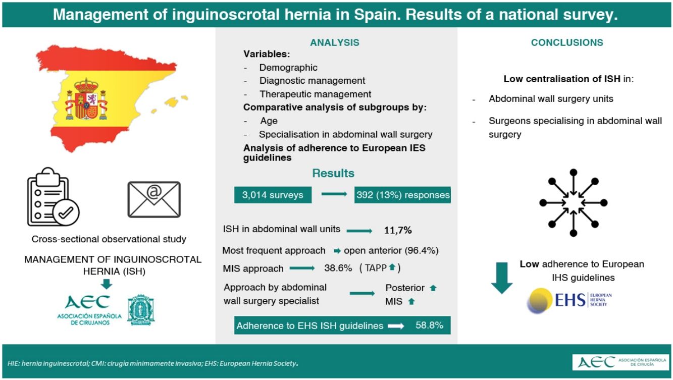 MethodsA cross-sectional observational study was conducted through an online survey distributed among members of the Spanish Association of Surgery (AEC). Demographic variables and specific data on the diagnostic and therapeutic management of ISH were collected. Subgroup analyses were performed based on age and specialization in abdominal wall surgery.