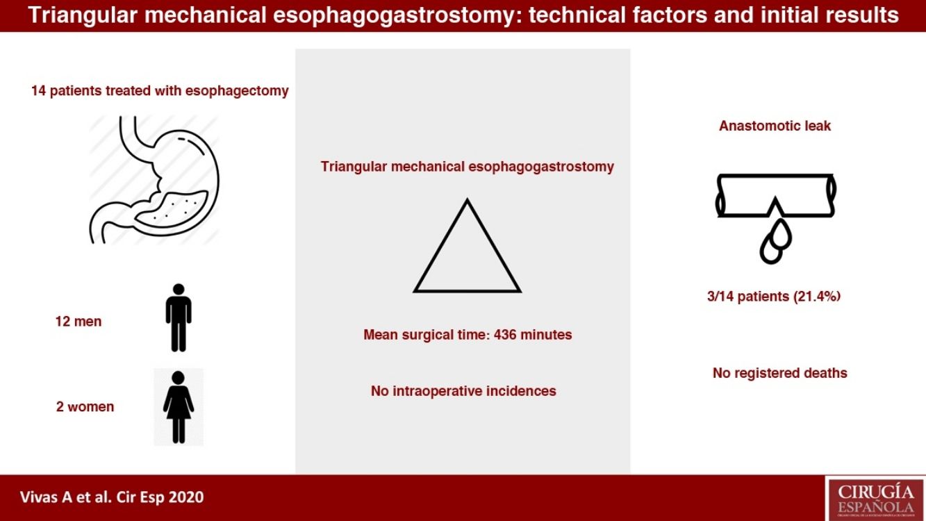 Please cite this article as: Vivas López A, Rodríguez Cuellar E, García Picazo A, Narváez Chávez C, Gómez Rodríguez P, Ortiz Aguilar M, et al. Esofagogastrostomía triangular mecánica: aspectos técnicos y resultados iniciales. Cir Esp. 2022;100:230–234.