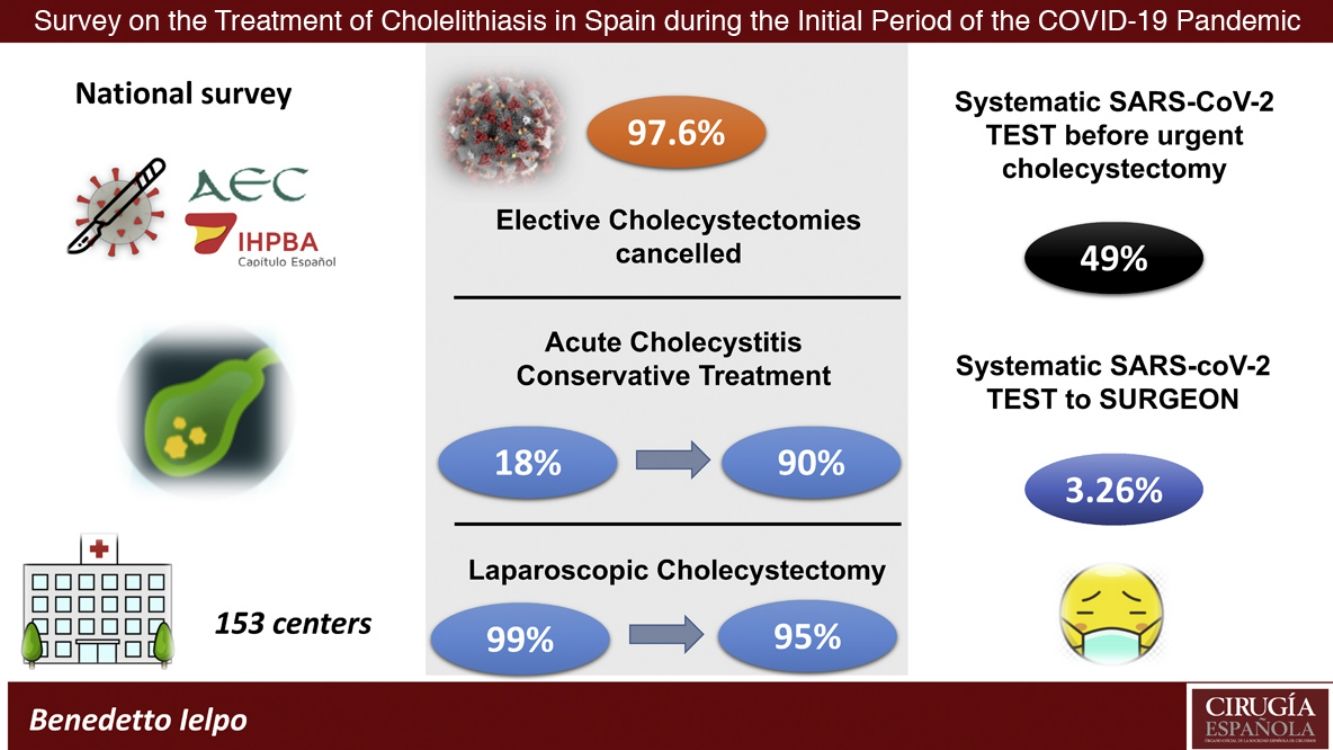 ResultsWe received 153 answers (one per hospital). Elective cholecystectomies have been cancelled in 96.7% of centres. Conservative treatment for acute cholecystitis has been selected in 90% (previously 18%), and if operated, 95% have been performed laparoscopically. Globally, only 49% perform preoperative diagnostic tests for SARS-CoV-2, and 58.5% recognize there have been cases confirmed postoperatively after other surgeries, with worse surgical outcomes in 54%.