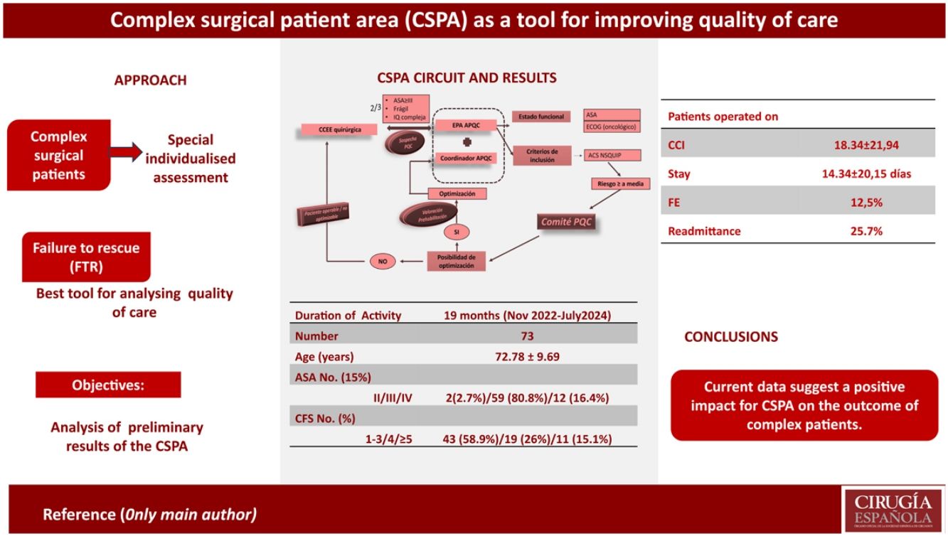 Given the increasing complexity of surgical patients, their evaluation within a Complex Surgical Patient Area (APQC) is essential. This study aims to present the functioning of the APQC and analyse its outcomes.