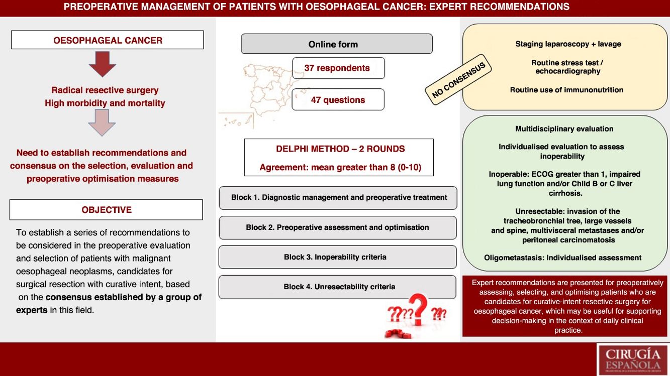 Of the respondents, 54% were women, with a mean age of 50.2 years, with more than 15 years of average experience in oesophageal surgery. In the preoperative evaluation, agreement was obtained on most of the recommendations, with the indication of a staging laparoscopy being the only one where it was not reached. In the preoperative optimisation, agreement was reached on nutritional, anaemia, physical status, respiratory and comorbidities evaluation, but no agreement was reached on recommending immunonutrition or echocardiography routinely. In the inoperability criteria were included ECOG greater than 1, impaired lung function, and/or Child B or C liver cirrhosis. Agreement was reached on considering unresectable tumours with invasion of the tracheobronchial tract, large vessels, and spinal column, multivisceral metastases, and/or peritoneal carcinomatosis.
