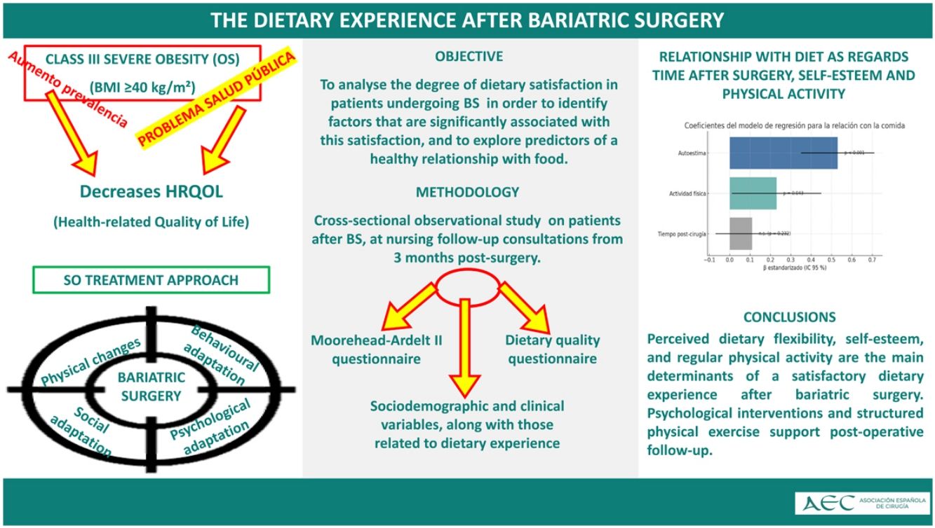ConclusionesLa percepción de flexibilidad dietética, la autoestima y la práctica regular de actividad física son los principales determinantes de una experiencia alimentaria satisfactoria tras la cirugía bariátrica, por encima del mero paso del tiempo. Estos resultados apoyan la inclusión de intervenciones psicológicas y de ejercicio físico estructurado en el seguimiento multidisciplinar postoperatorio.