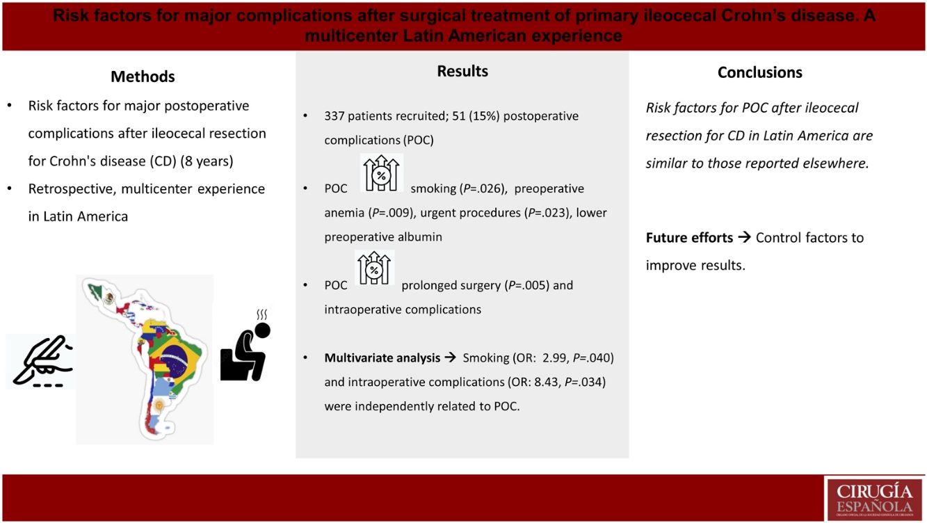 Please cite this article as: Surgical IBD Latam Consortium. Risk factors for major complications after surgical treatment of primary ileocecal Crohn's disease. A multicentric Latin American experience. Cir Esp. 2023. https://doi.org/10.1016/j.cireng.2023.05.002.