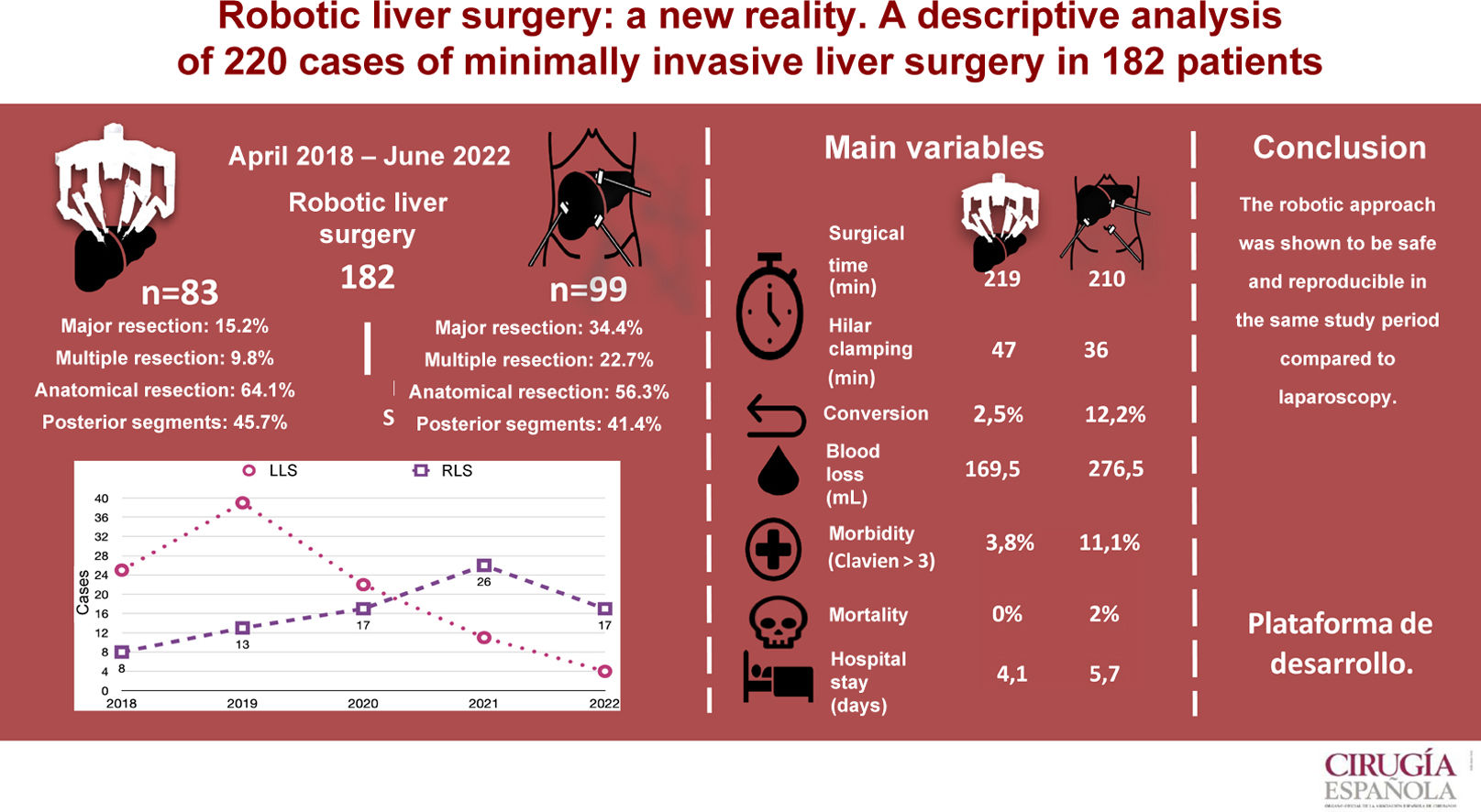 El nivel de recomendación del abordaje robótico en la cirugía hepática es controvertido. Se realiza un análisis descriptivo, retrospectivo yunicéntrico de los resultados a corto plazo de la cirugía hepática robótica y laparoscópica en un mismo periodo.