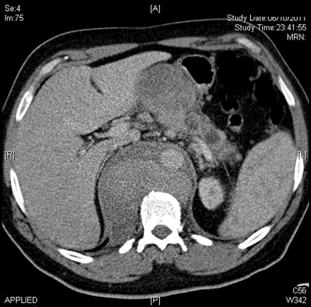 The patient was discharged from the hospital after one week but was re-admitted 10 days later due to an episode of upper gastrointestinal bleeding. Upper GI endoscopy revealed bleeding at the duodenal level that could not be sclerosed. We therefore ordered thoracic and abdominal CT studies with contrast, which showed a hematoma in the duodenal region with signs of active bleeding. The gastroduodenal artery was embolized. Due to persistent gastrointestinal bleeding, we decided to perform exploratory laparotomy, where we observed bleeding in the 1st and 2nd portions of the duodenum. Subtotal gastrectomy was performed and samples were sent for pathology studies. The duodenum was packed with gauze, which was removed 72h later. The results of the pathology report showed that the small intestine wall was infiltrated by a poorly differentiated malignant neoplasm compatible with high-grade angiosarcoma of large blood vessels, probably originating in the aorta. Once week later, the patient continued to become more anemic due to gastrointestinal hemorrhage and blood loss through the drain tubes, resulting in his death.