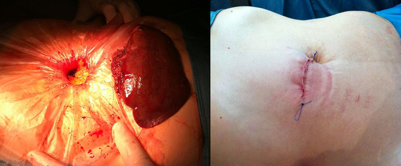 Liver transection was performed in all cases without preparation for hilar occlusion; rigid instruments were used. Hemostasis with monopolar coagulation and hemostatic sponge was revised (TachoSil® medicated sponge, Takeda-Nycomed Austria GmbH, Linz, Austria). A drain was left in 2 cases by the surgeon's subjective decision. The surgical specimen was extracted by the single incision and laparotomy was closed in layers with absorbable sutures in peritoneum and nonabsorbable for the anterior sheath (Fig. 2).