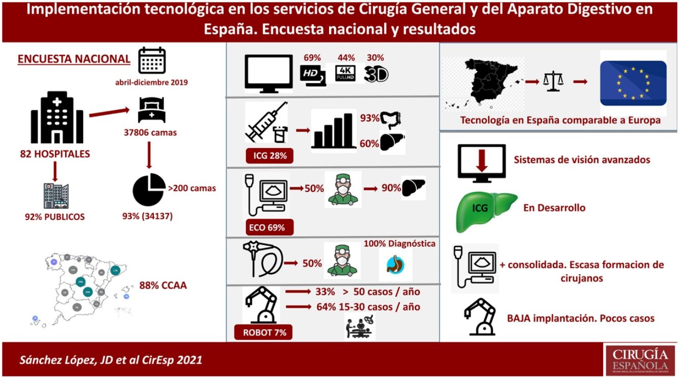 Please cite this article as: Sánchez López JD, Acosta Mérida MA, Toledano Trincado M, Segura Sampedro JJ, Trébol López J, Aranzana Gómez A, et al. Implementación tecnológica en los servicios de Cirugía General y del Aparato Digestivo en España. Encuesta nacional y resultados. Cir Esp. 2021;99:707–715.