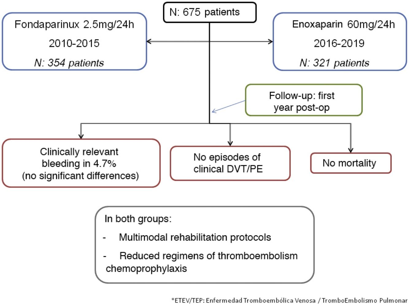 Results675 patients were included; 354 with Fondaparinux-Arixtra® during the period 2010−2015 and 321 with Enoxaparin-Clexane® during the period 2016−2019. There were no cases of DVT or clinical PE. However, the incidence of hemorrhage requiring reoperation, transfusion, or a decrease of more than 3g/dL hemoglobin was 4.7%, with no difference between groups. Mortality was nil. The average stay was 2.8 days and the outpatient follow-up was 100% during the first 6 months and 95% at 12 months.