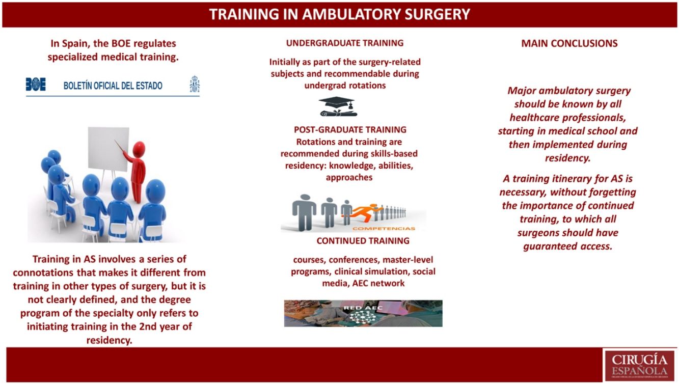 Thus, it seems timely for the Ambulatory Surgery and Postgraduate Training Divisions of the Spanish Association of Surgeons (Asociación Española de Cirujanos, or AEC) to provide a series of proposals and reflections about how to train our surgeons in order to treat patients with the highest levels of guaranteed safety in ambulatory surgery, and how hospital administrators can promote and encourage the development of training programs.