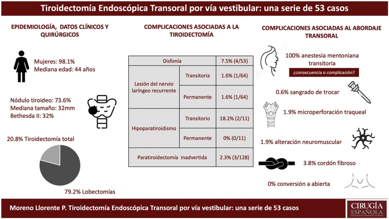 Regarding the morbidity of our series, the intrinsic complications entailed in a thyroidectomy and those associated with the transoral approach are presented separately (Table 3).