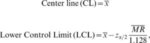 , is the sample mean and is a value from the standard normal distribution such that the area above it is is the moving range mean; 1.128 is a correction value;5 and α% is the false alarm rate, which controls the percentage of sample observations that will randomly fall outside the control chart limits (above the UCL or below the LCL). A very common value is 3 which under the normal distribution corresponds to a false alarm rate of 0.27%. That means that in the long run 0.27% from the observations plotted in the chart are expected to fall out of the control limits even if the parameters of the process remain unchanged. The quantity (/1.128) is an estimate of the standard deviation of the variable of interest (X). In this study, the value = 3 will be used.The values of the variable of interest per unit of time and the control limits are placed on the chart. Statistical instability (indicating that the process is out of control) is indicated when sample points are observed higher than the UCL or lower than the LCL.