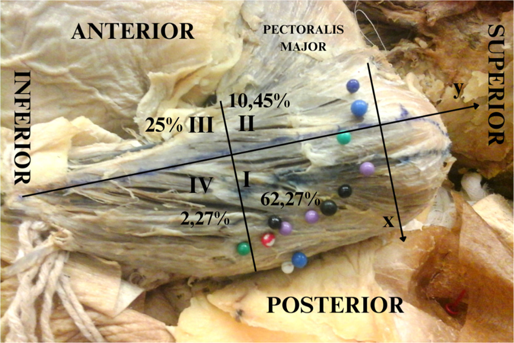 Left deltoid from a dissected cadaver. Y-axis cross the humeral tubercle and the deltoid insertion point into the humerus. The tubercle is defined as the point (0, 0), and the numbers I, II, III, and IV represent the quadrants created in order to localize the insertions of the axillary nerve into the deltoid muscle.