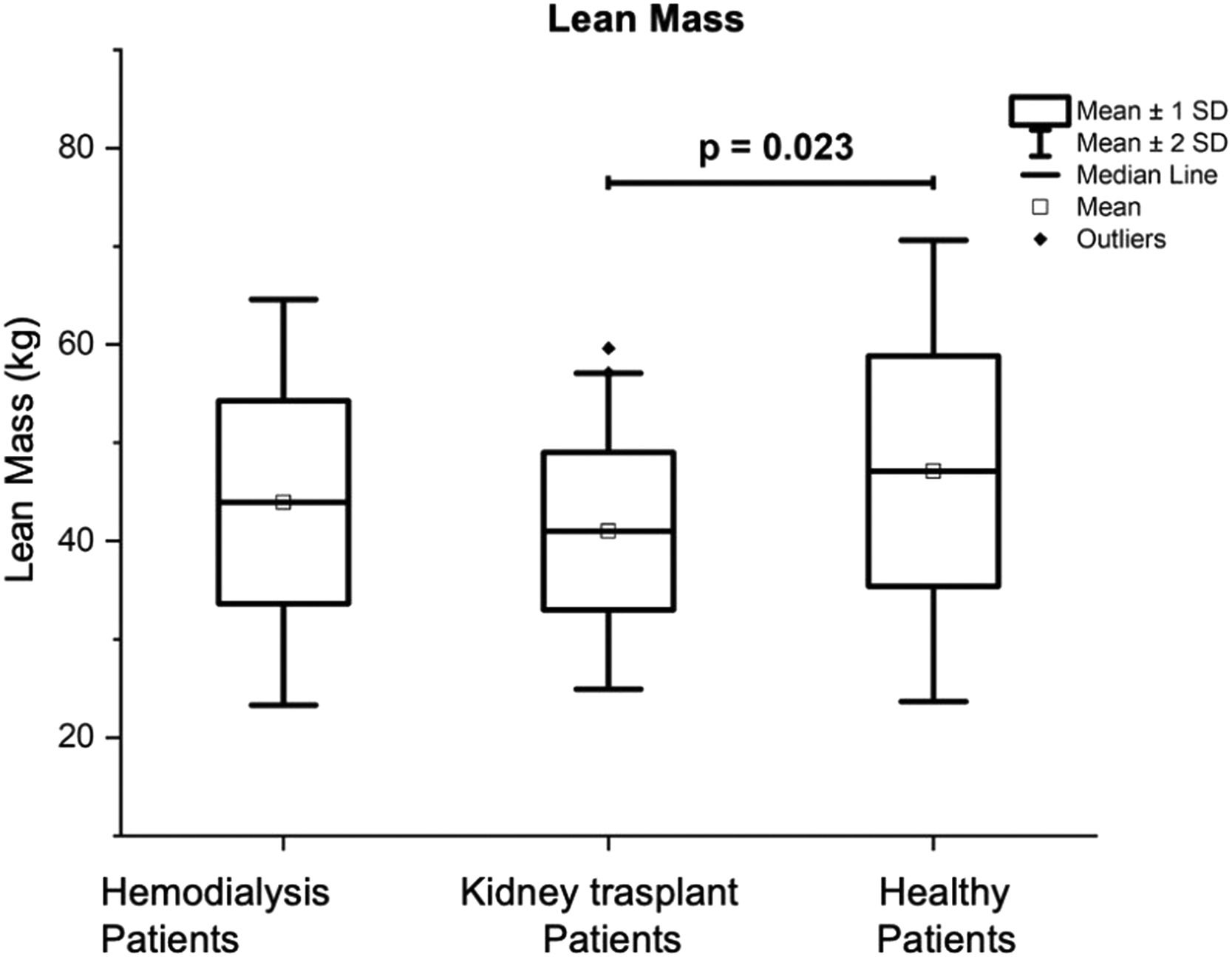DiscussionThe results of this research demonstrated that HD patients presented lower figures in the results of total body fat mass, trunk fat mass, and total trunk fat weight percentage when compared to those in the control group, and with those of patients with KT. TFM and lower extremity lean mass were significantly lower in KT patients compared with those in the control group.