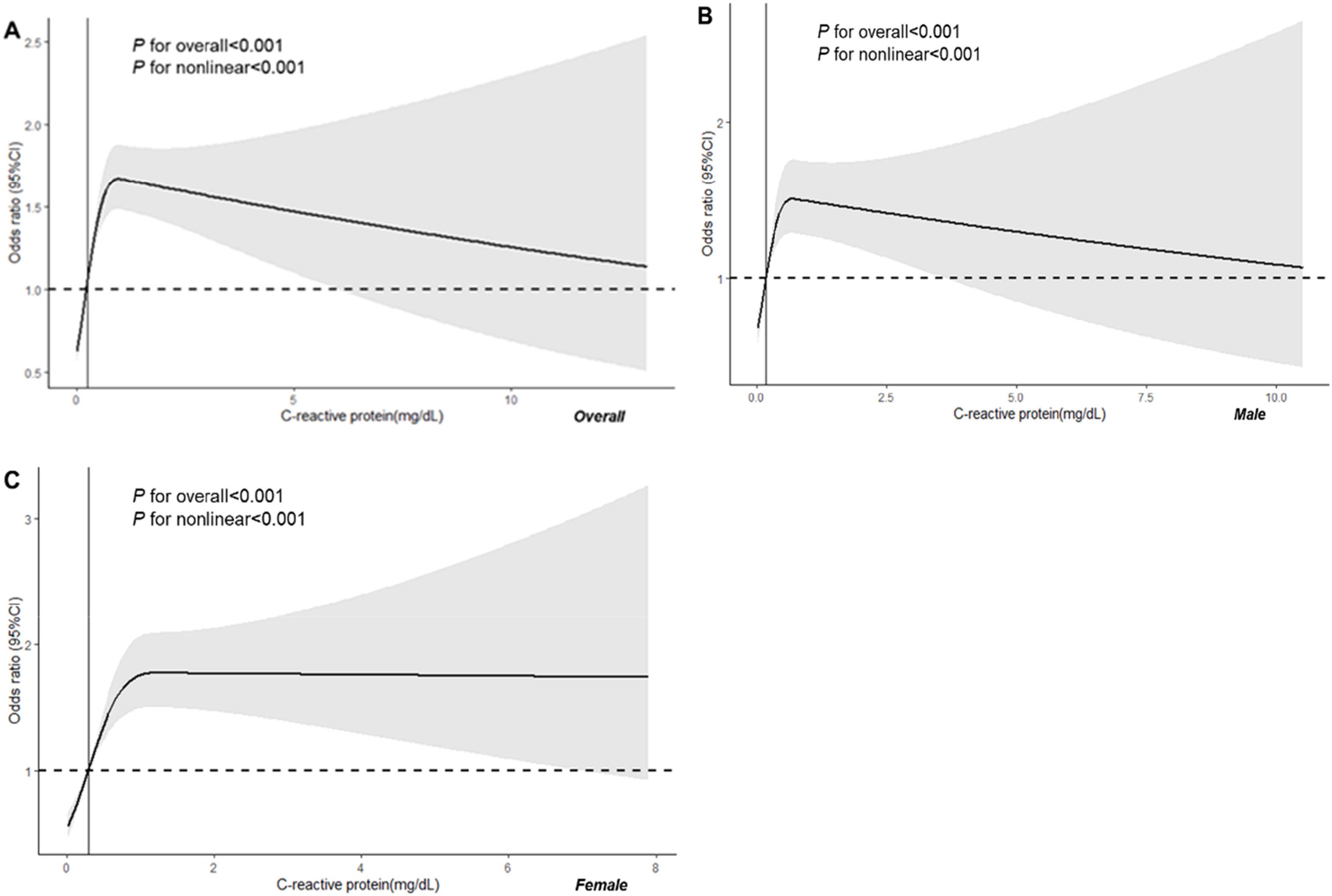 Gender-specific analysis revealed that in males when the serum CRP level was ≤ 0.172 mg/dL, there was a significant decrease in the odds of low muscle mass (OR = 0.69, 95 % CI 0.64‒0.74, p < 0.001). Conversely, when the serum CRP level exceeded 0.172 mg/dL, there was a significant increase in the odds of low muscle mass (OR = 1.46, 95 % CI 1.35‒1.57, p < 0.001). In females, when the serum CRP level was ≤ 0.296 mg/dL, there was a significant decrease in the odds of low muscle mass (OR = 0.77, 95 % CI 0.73‒0.83, p < 0.001). However, when the serum CRP level exceeded 0.296 mg/dL, there was no significant difference in the odds of low muscle mass (OR = 1.30, 95 % CI 0.73‒0.83, p < 0.001). These results indicate a clear association between serum CRP levels and the risk of low muscle mass (Table 4).