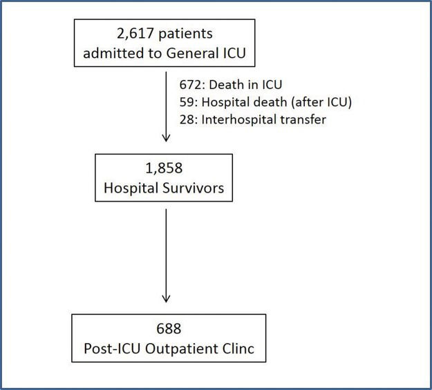 Both the hospital and outpatient clinical records were analyzed to include patients admitted to the general adult ICU from December 2007 to December 2014 who were discharged alive from the hospital and evaluated at the Post-ICU Outpatient Clinic 3 months later. (Thus, the patients were evaluated at the Post-ICU Outpatient clinic between February 2008 and February 2015).