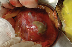 After cardiac evaluation, an elective laparotomy was performed. The surgery revealed an inflammatory aortic aneurysm with clearly visible local wall necrosis (Picture 3). After clamping the aorta, the aneurysm sac was incised, releasing a great volume of thrombosed and liquefied clots under significant pressure. The aorta and both iliac common arteries were sutured, and no bypass was performed. The postoperative course was unremarkable, and the patient was sent home on the sixth postoperative day. He continued with ambulatory consultations. On the 40th postoperative day, the patient returned to the emergency room in a septic state with abdominal pain, ascites and circulatory shock. The patient expired in the emergency room before surgery could be performed, despite aggressive attempts to resuscitate him. The post mortem examination revealed diffused peritonitis as a consequence of mesenteric ischemia and perforation of the small intestine, associated with pancreatitis. There was neither an aortic stump blow-out nor a colon ischemia.