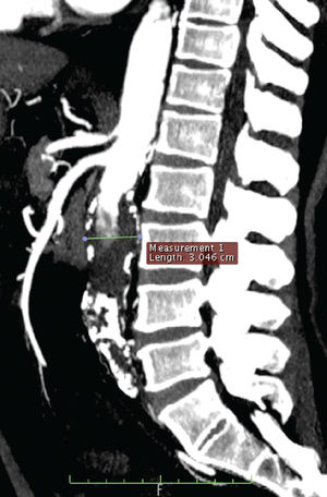 Late rupture of surgically induced thrombosed AAA has been reported.1,5,7 Schwartz et al.15 analyzed 13 patients with AAA thrombosis and extra-anatomic bypass and reported a delayed aneurysmal rupture of 15% in only 6 months. These reports emphasize the concept that the thrombosis of an abdominal aortic aneurysm does not absolutely preclude rupture.7 Another technique that is described is a retroeritoneal approach using ligation of the aorta and proximal and distal ligation of the aneurysm (exclusion), coupled with an aortic bypass. Resnikoff16 related a rupture incidence of 0.8% over ten years. We opted for an extra-anatomic bypass in our second case because the patient had a small aortic aneurysm (3.5 cm) and was at high operative risk. However, the assumed risk for late rupture implies that close follow-up is imperative to detect any expansion of the aneurysm.