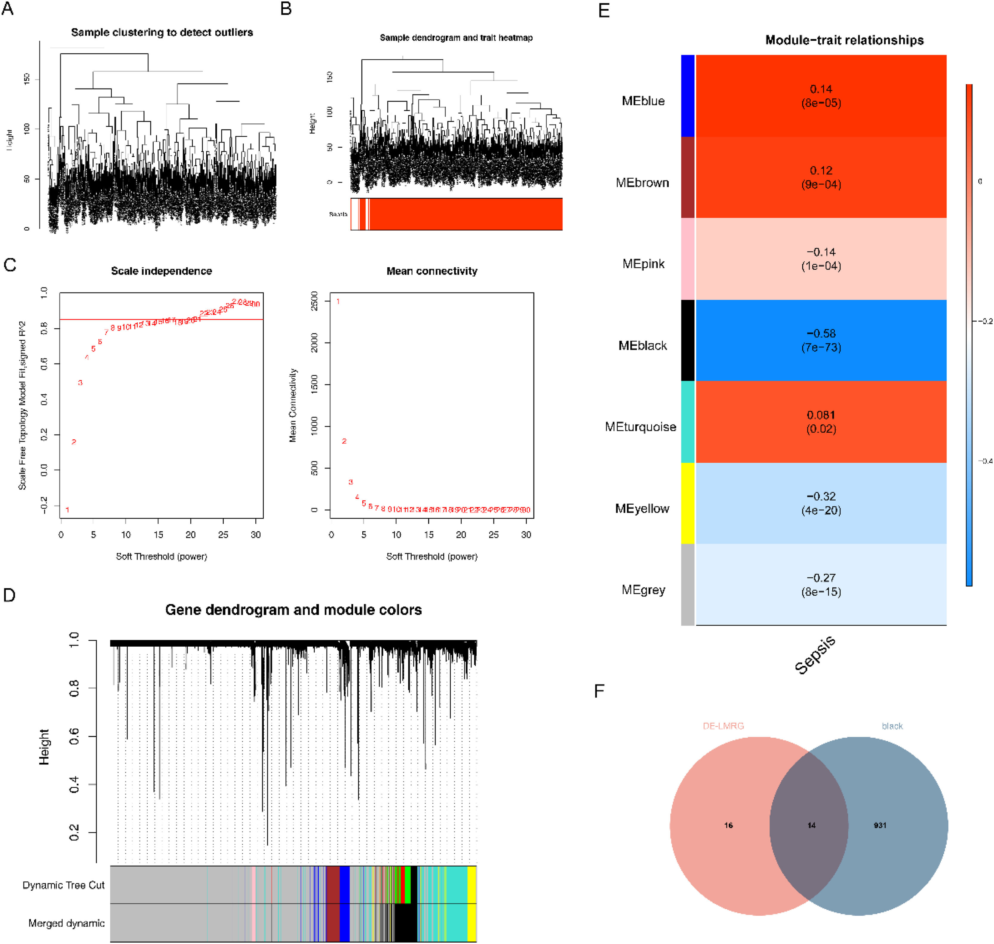 The WGCNA package (version 1.70–3)11 was utilized to construct a network in the GSE65682 dataset to screen for Sepsis-related modules. The authorsconsidered disease state (normal and Sepsis) as the trait data for WGCNA. First, samples were clustered to delete the abnormal samples. According to clinical feature information, sample clusters and clinical feature heatmaps were plotted, and the soft thresholds was determined. Based on the optimal soft threshold, the minimum number of genes in each gene module was set according to the criteria of the hybrid dynamic tree cutting algorithm. Correlation between modules and disease state was computed to sift out key modules. Overlap analysis was implemented on key module genes and DE-S-LMRGs in the PPI network, and the authorsconsidered the intersected genes as key genes.