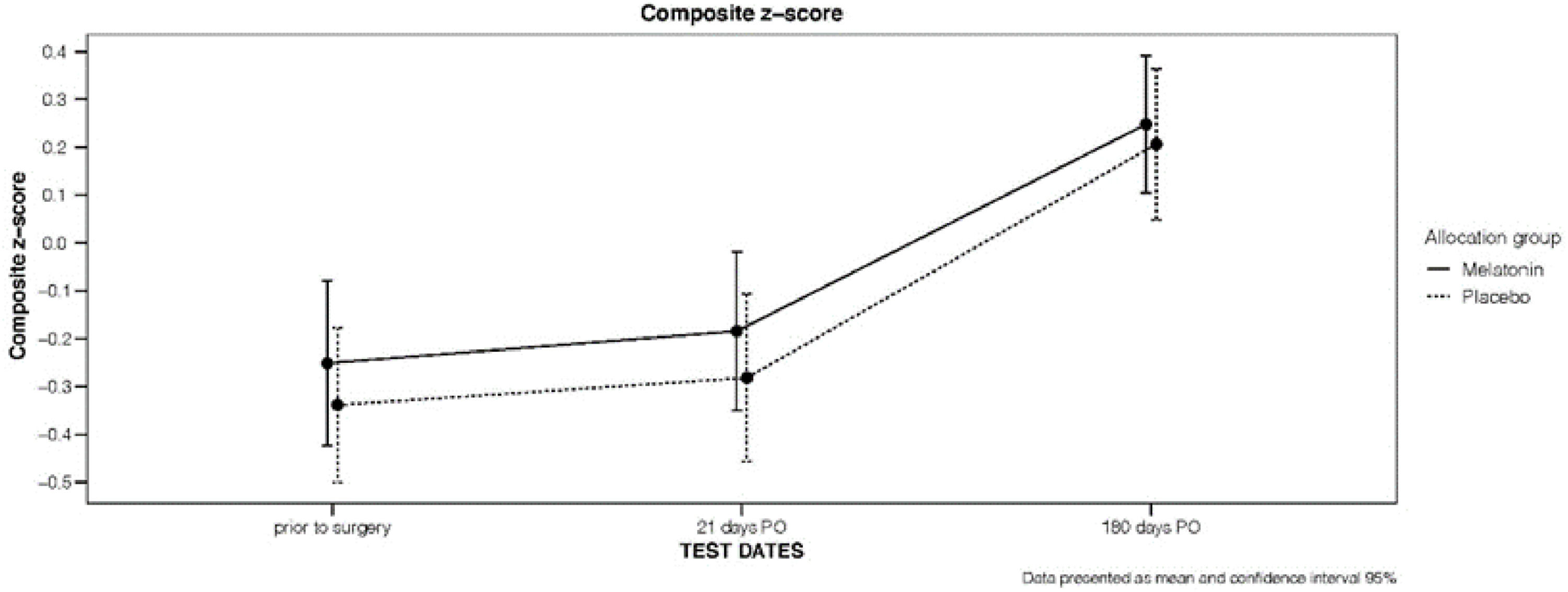 ResultsPre-surgery, both groups had significant cognitive deficits. Delayed cognitive recovery at 21 days PO was the same in both. There were no cases of POCD at 180 days. The melatonin group performed better in the delayed-recall FOME, which assesses memory, and in the Digit Span test, which assesses attention and cognitive flexibility. Unexpectedly, global neurocognitive performance was improved at 180 PO in both groups.