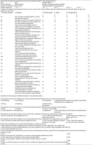 Participants were given a validated WSAQ 24 (Appendix 1), as well as 9 questions about their subjective perceptions of stress, work environment, career, future professional prospects and evolution of motivation and competence over time. The complete research form, called the Medical Experts' Stress Questionnaire (MESQ), was applied between February and June 2017 and can be found in Appendix 1. The WSAQ is composed of 23 statements to be rated on a scale from 1 to 5, depending on the level of agreement. A respondent's situation was considered stressful if the arithmetic mean was greater than or equal to 2.5 24. The evaluation proceeds to items 2 and 3 of the MESQ, which address professional activities and work environments, respectively. Questions 4 to 8 surveyed the temporal evolution of stress or anxiety, motivation, competence and career success and were intended to assess whether negative psychological factors caused impacts or losses to users of the social security system. More specifically, question 6 sought indications of significant emotional impairment still controlled by internal mechanisms (second response option), or even marked emotional exhaustion (third response option), which could support the diagnosis of burnout.