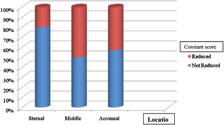 Our results showed no statistically significant correlation between clavicle fracture location and the Constant score. The clavicle fracture location did not appear to affect shoulder function. The current recommendation for an unstable distal clavicle fracture is surgery; however, the number of distal clavicle fractures in our sample was small (7 patients). A larger sample may have altered the results. Krüger–Franke et al. (2001) reported very good outcomes in a series of 41 patients with lateral clavicle fractures who were treated with the K-wire stabilization with cerclage and AO-plate osteosynthesis. An 8-year follow-up revealed good or very good outcomes in 97% of these subjects.12 Surgical treatment is recommended for unstable distal clavicular fractures, and several surgical methods have been proposed, including extraarticular or transarticular K-wire fixation, coracoclavicular screw fixation, tension band wiring and clavicular plate fixation.13 Khashif Khan et al. (2009) also reported that shaft fractures occur most often in young adults, while medial and lateral end fractures are more common in older age groups.14