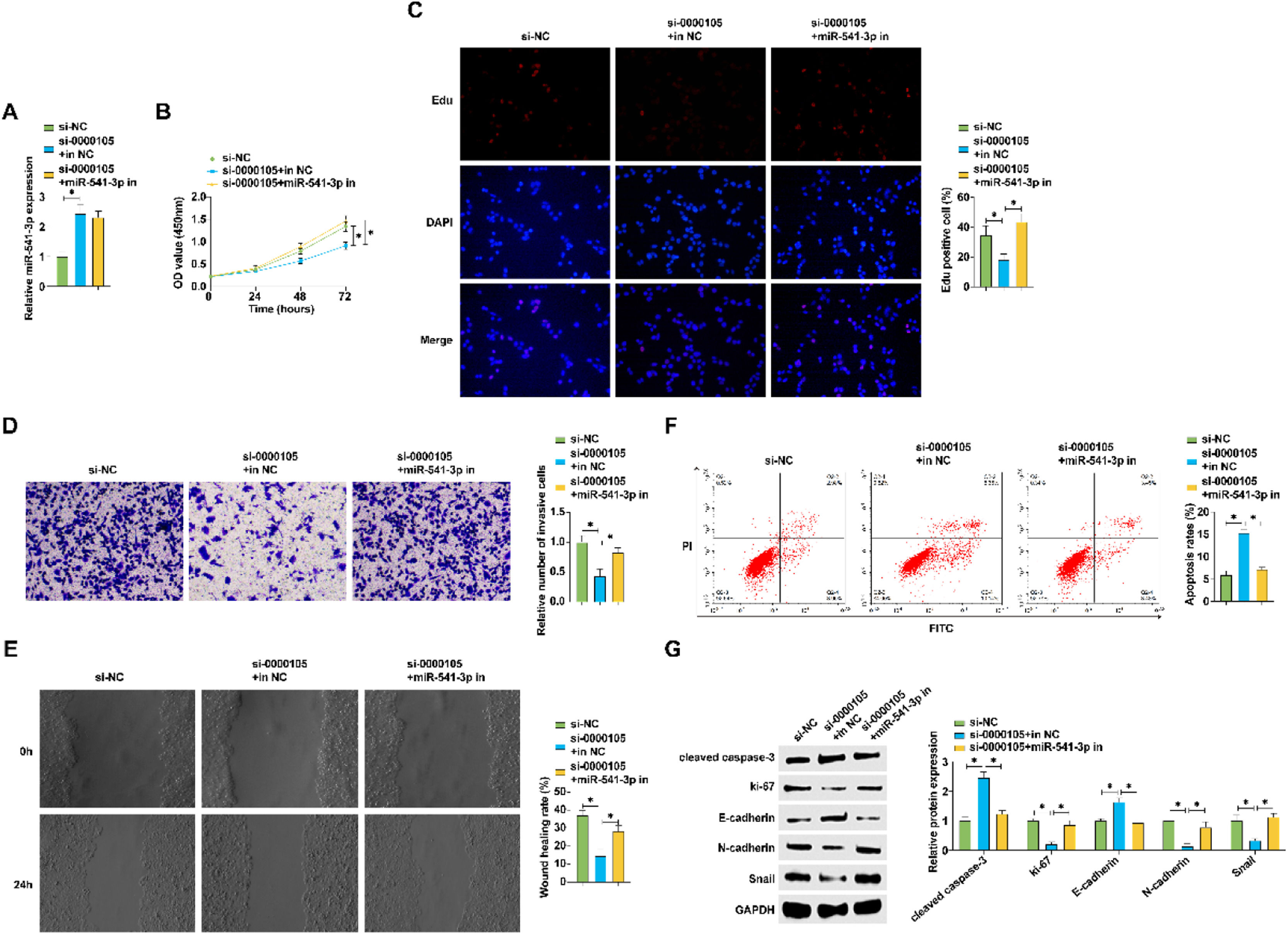 hsa_circ_0000105 modulates NPC malignancy through regulation of miR-541-3p expression. (A) RT-qPCR assessing the impact of hsa_circ_0000105 siRNA and miR-541-3p inhibitor on miR-541-3p levels in HNE2 cells; (B) CCK-8 assay for proliferation rate; (C) Edu staining quantifying proliferative cells; (D) Transwell assay for invasive cell count; (E) Wound healing assay assessing cellular migration; (F) Flow cytometry for apoptosis rate; (G) Western blot analysis of Ki-67, N-cadherin, Snail, cleaved caspase-3, and E-cadherin expression. Data represent mean ± SD (n = 3); * p < 0.05.