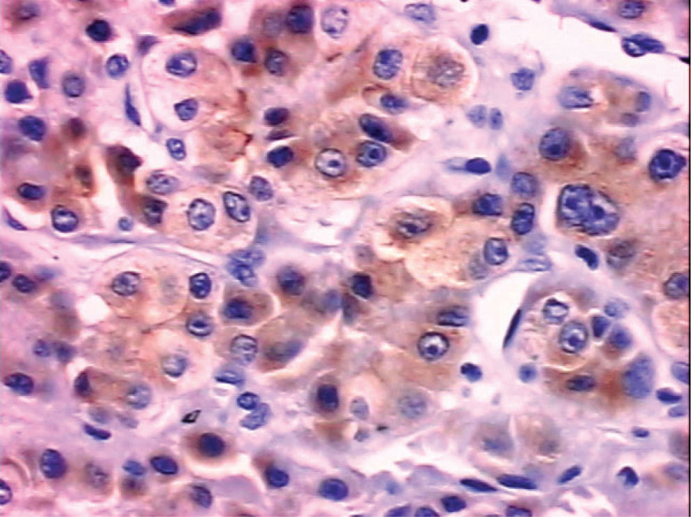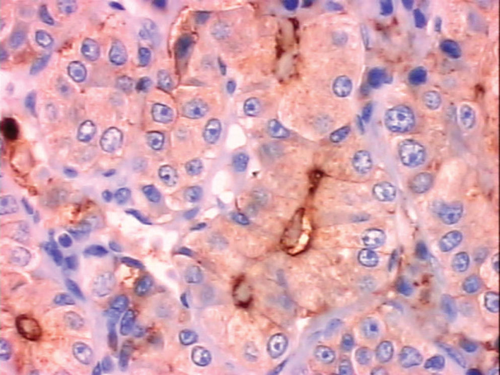 The pathological diagnosis of an orbital metastasis from hepatocellular carcinoma is usually straightforward and commonly guides the investigation toward the primary tumor. The typical appearance is that of a trabecular pattern associated with polygonal cells that have an acidophilic cytoplasm, large round or oval nuclei, and prominent nucleoli. Immunohistochemistry may be helpful and typically demonstrates staining of tumor cells with CAM 5.2, and of bile canaliculi with polyclonal CEA. Although serum levels of alpha-fetoprotein are elevated in up to 90% of patients, expression on immunohistochemistry is only found in 30% to 50% of the primary tumors.7,10 Interestingly, other cases of orbital metastases with normal serum levels9 or negative tissue expression of alpha-fetoprotein have been reported.7