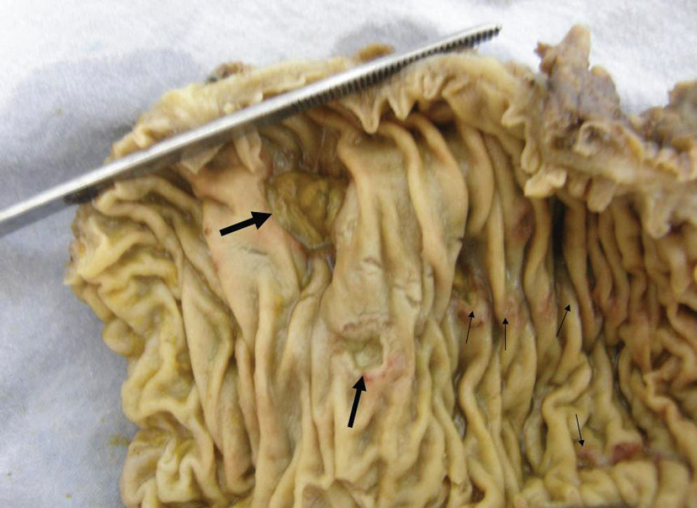 There was no ulcerative lesion determined by lower and upper GI endoscopy performed three months after surgery. It is also possible that intestinal ulcers might have healed with the corticosteroid and immunosuppressant agents added to the patient’s therapy before endoscopic evaluation.