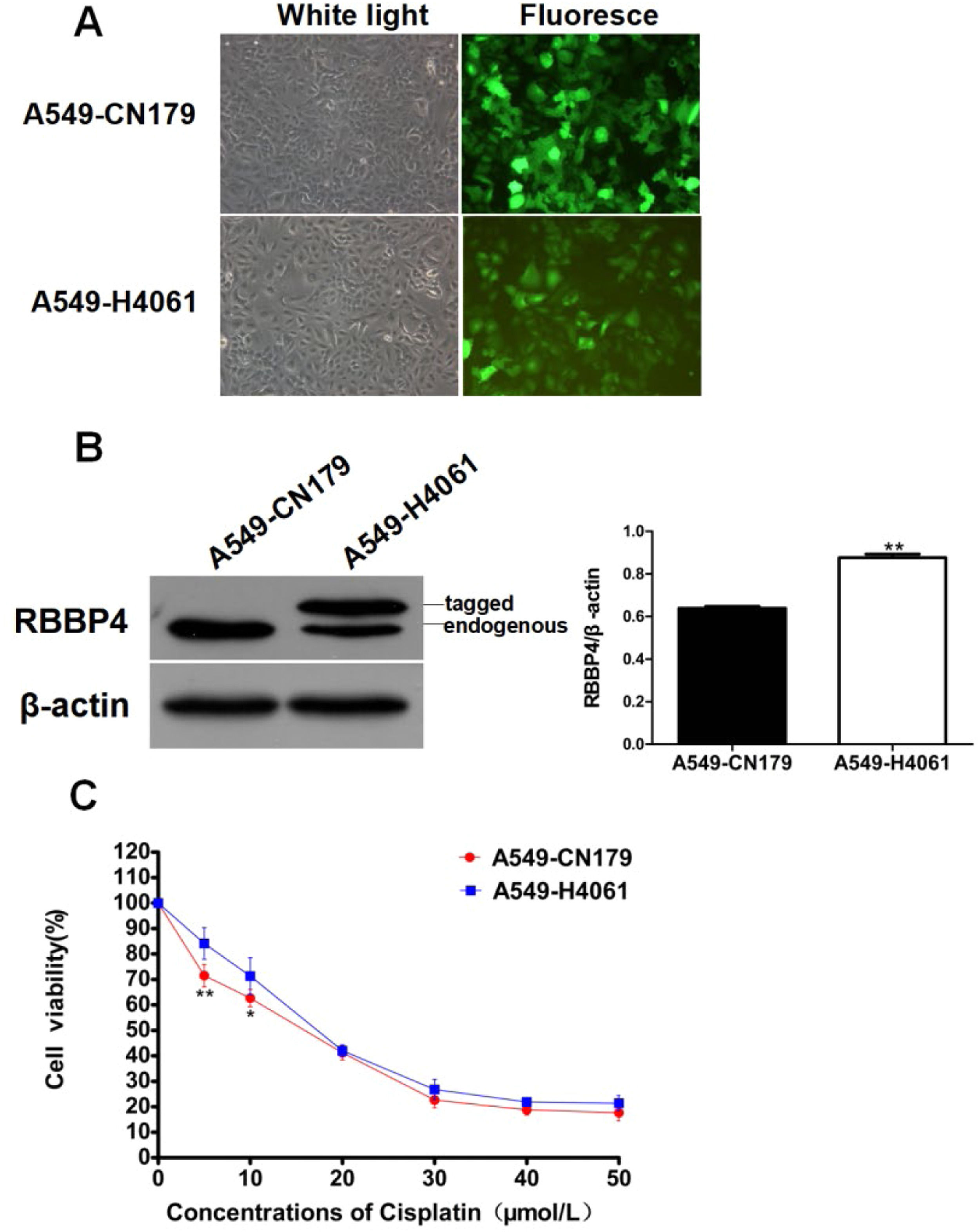 RBBP4 overexpression reduced cisplatin sensitivity in A549 cells. (A‒B) A549-H4061 cells expressed both exogenous and endogenous RBBP4 protein. (C) The sensitivity of A549-H4061 cells to cisplatin was lower than A549-CN179 cells. Data are reported as means ± SD with three replicates. *p < 0.05, **p < 0.01, ***p < 0.001. RBBP4, Retinoblastoma-Binding Protein-4.