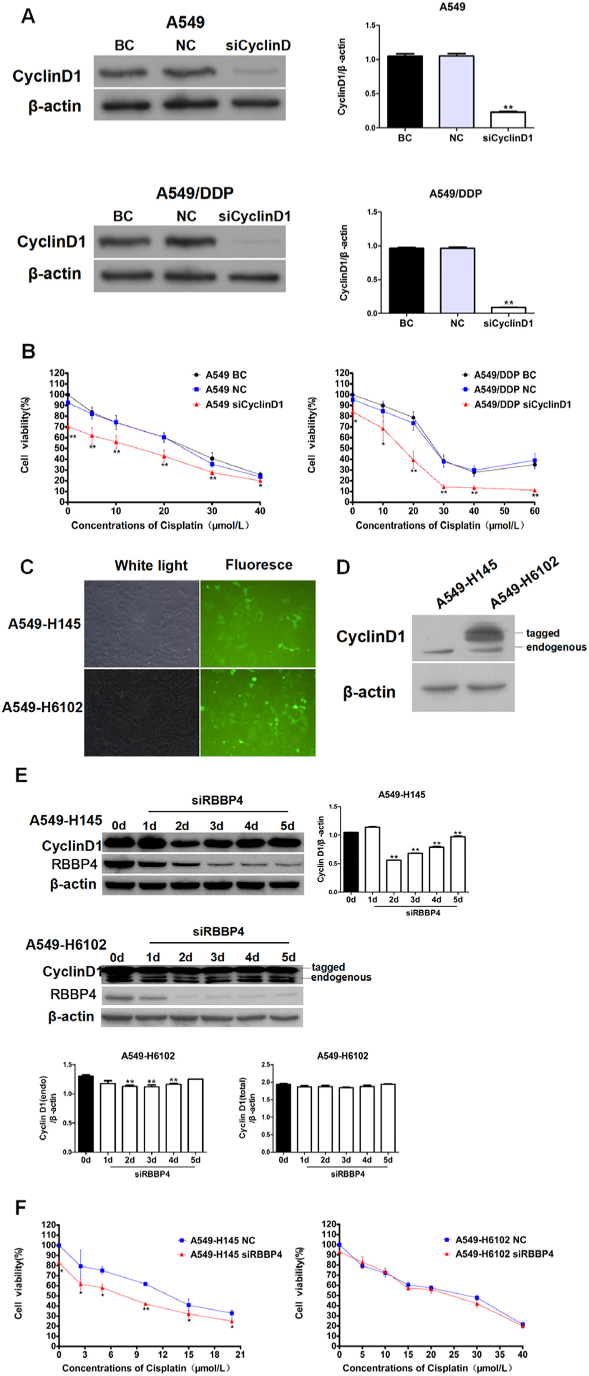 Cyclin D1 suppression was crucial for cisplatin sensitization by RBBP4 downregulation. (A) siRNA was used to downregulate cyclinD1 protein expression in A549 and A549/DDP cells. (B) Cells with siCyclinD1 and cisplatin combined treatment resulted in enhancements of cisplatin sensitivity. (C‒D) CyclinD1 overexpression could antagonize cisplatin toxicity. Scale bar is 200 μm. (E) CyclinD1 expression of the A549-H6102 cells maintained at a high level. (F) No changes in cisplatin sensitivity were found in the A549-H6102 cells after RBBP4 downregulation. Data are reported as means ± SD with three replicates. * p < 0.05, ** p < 0.01, *** p < 0.001. RBBP4, Retinoblastoma-Binding Protein-4; BC, Blank Control; NC, siRBBP4 Negative Control.