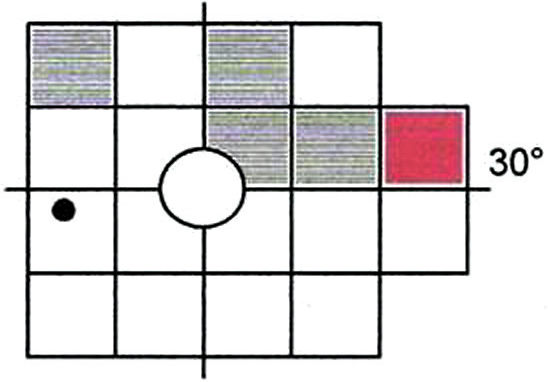 Subsequent psychophysical testing confirmed a superior initial defect on the visual field of this eye with conventional achromatic perimetry (SITA Standard 24-2) (Figure 2) and frequency doubling perimetry (Figure 3). Short-wavelength perimetry was normal OU. The nerve fiber analysis with scanning laser polarimetry (GDx VCC – Laser Diagnostic Technologies, San Diego, CA) showed nerve fiber layer regional inferior defects OU, which were more evident in the left eye (Figure 4), both on the reflectance image and on the retardation image. Confocal scanning laser ophthalmoscopy (HRT - Heidelberg Retina Tomograph, Heidelberg Engineering GmbH, Germany) was borderline in the left eye, and optical coherence tomography (Stratus OCT – Carl Zeiss Meditec) was unremarkable. Except for the GDx, all tests were normal for the right eye.