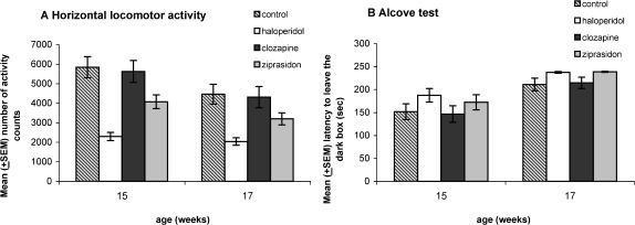 Horizontal locomotor activity and alcove testTo examine the sedating impact of the neuroleptics, we investigated locomotor activity and exploratory behavior in the alcove test at weeks 15 and 17.