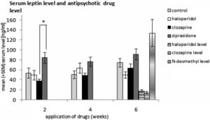 Blood leptin and drug concentration and leptin receptor expression in the hypothalamusWe found a mean value of 18.3 ± 2.7 ng/ml haloperidol, 14.4 ± 2.2 ng/ml clozapine, and 134.0 ± 26.9 ng/ml N-desmethylclozapine in the serum after 6 weeks of antipsychotic drug application.