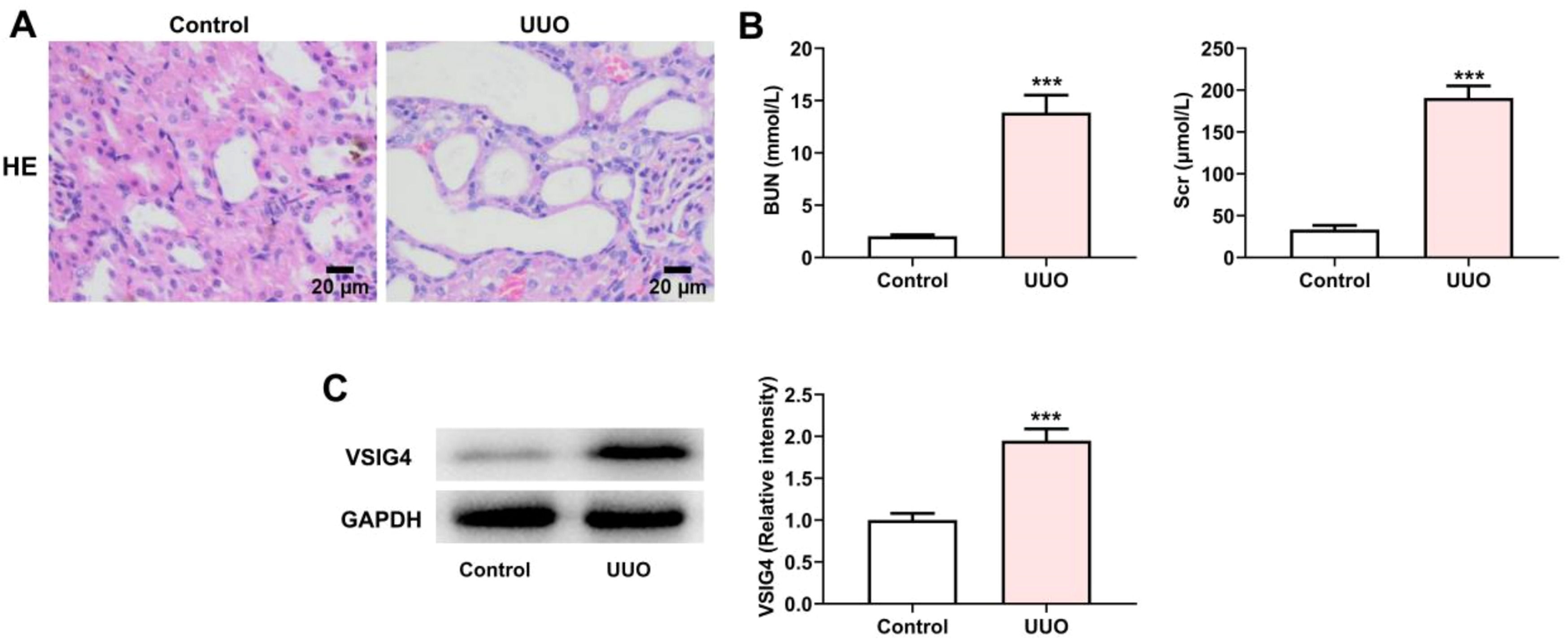 To investigate the expression of VSIG4 in renal fibrosis, we first constructed a UUO mouse model as described previously. HE-staining was used to detect the pathological changes of the kidney. The results showed that the renal tubular epithelial cells in the UUO model group were detached into the lumen, the proximal renal tubular structure was absent, and the distal renal tubules were dilated (Fig 7A). The assessment of renal function in clinical practice mainly relies on the assessment of Scr and BUN levels.15 The levels of Scr and BUN were significantly increased in the UUO model group, indicating that UUO caused renal injury (Fig. 7B). Meanwhile, western blot results showed that VSIG4 expression was increased in UUO-induced renal fibrosis (Fig. 7C).