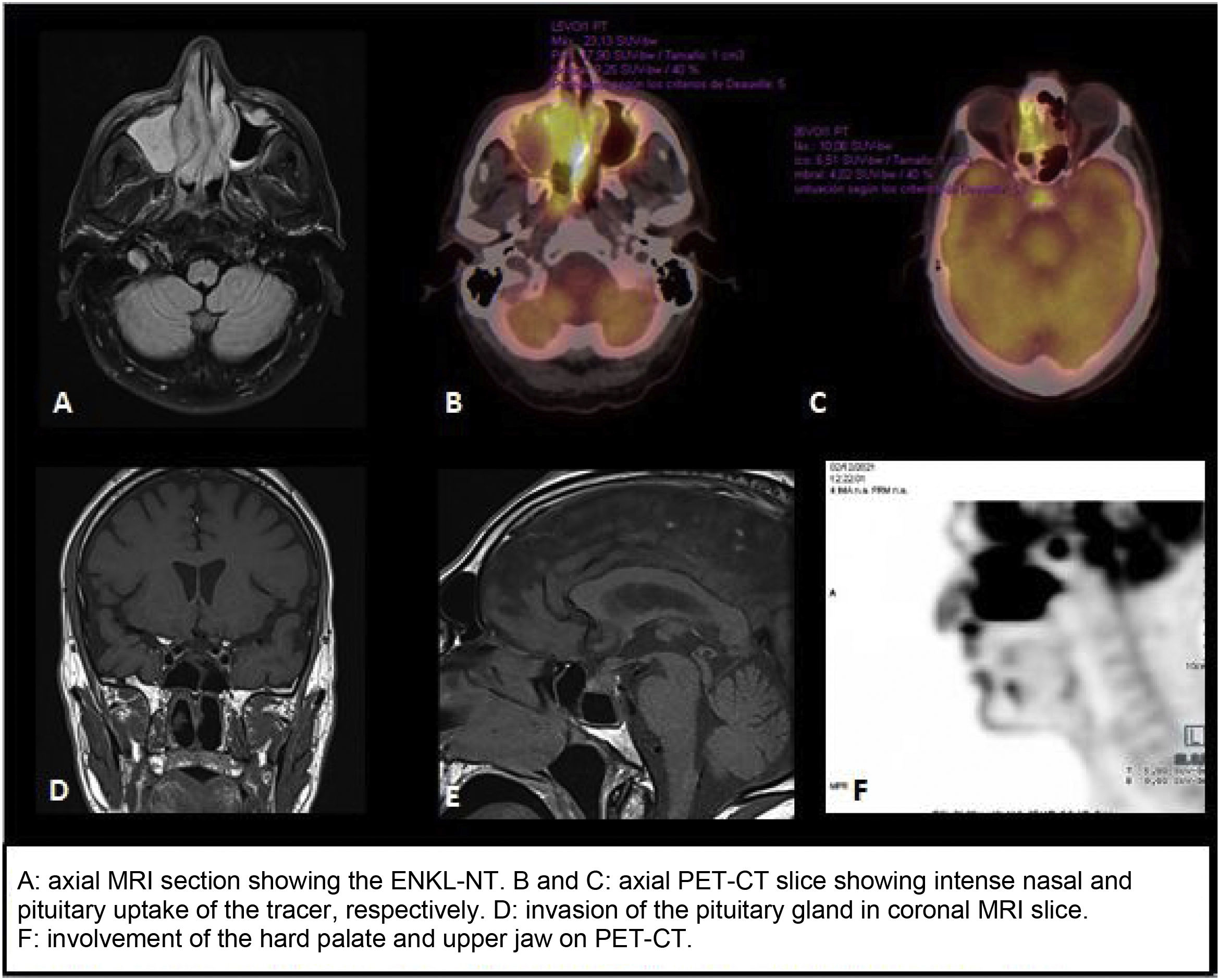 Extranodal natural killer (NK)/T-cell lymphoma, nasal type (ENKL-NT) is a subtype of lymphoma whose aetiology is not fully understood. It is related to the Epstein–Barr virus (EBV), detection of which is a requirement for diagnosis. It is more common in Asia and America than in the West, it predominates in 40–80-year-old men and affects the nasal area in 80% of cases, presenting with symptoms of nasal obstruction. The definitive diagnosis is histopathological. The treatment of choice is radiotherapy (RT) combined with chemotherapy (CT) in different regimens. The disease has a poor short-to-medium-term prognosis.