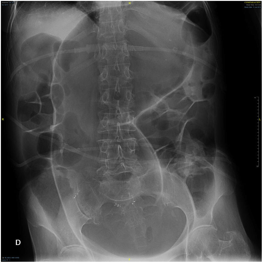 An abdominal X-ray was performed (Fig. 1), shown below. The objective findings allowed a diagnosis of certainty to be made.