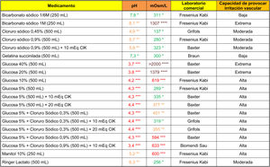 Data analysisBased on the information obtained regarding pH and osmolarity, each drug’s theoretical capacity to cause venous irritation or endothelial damage of each drug was determined according to the following classical classification8: