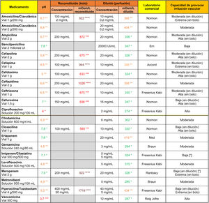 In the case of antibiotics (Table 2), vancomycin and ciprofloxacin showed a high irritant capacity related to their markedly acidic pH. All antibiotics indicated for direct intravenous administration were highly hypertonic when reconstituted in 10 ml of .9% saline. Their ability to cause vascular irritation decreased to moderate or low values when diluted in 100 ml saline.