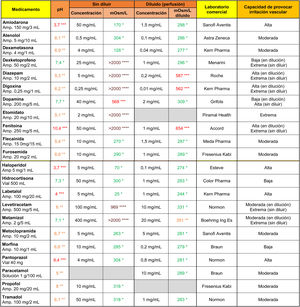 ResultsSamples from 19 drugs for fluid therapy, 21 antibiotics and 22 drugs for intravenous use were studied. Glucose solutions, sodium bicarbonate 1M and mannitol 10% showed a high capacity to cause venous irritation. Vancomycin, ciprofloxacin, amiodarone, haloperidol, and labetalol solution presented a high capacity for irritation based on their acidic pH. The antibiotics, dexketoprofen, diazepam, digoxin, etomidate, phenytoin, levetiracetam and metamizole also showed high osmotic values in their reconstituted or undiluted presentations. Moreover, osmolarity of diazepam, digoxin and phenytoin remained high despite being diluted in 100 ml of saline.