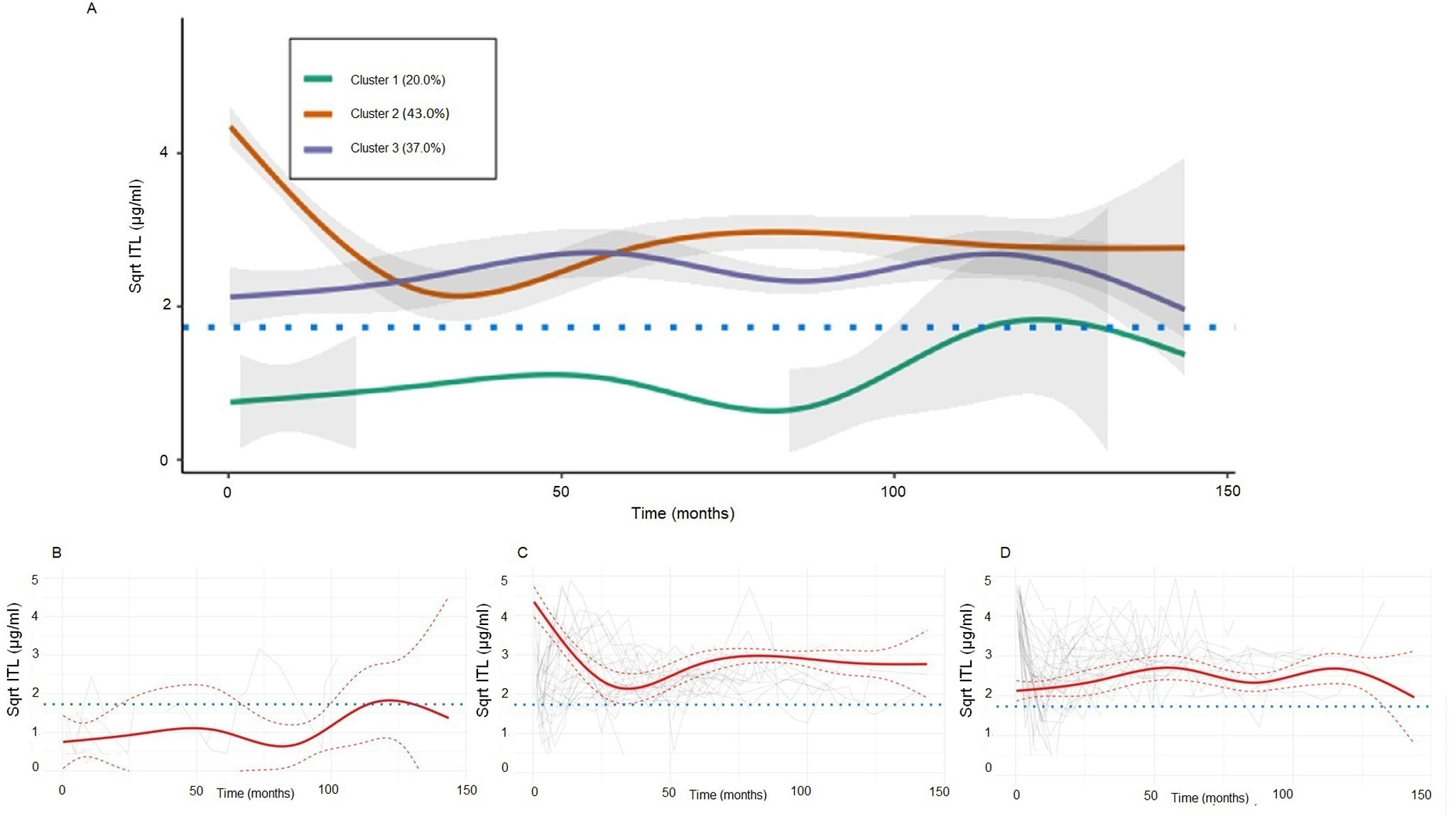 ResultsThe study included 165 IBD patients, and a total of 799 ITL samples were analyzed. The selected model included three clusters, with a random intercept and a random effect on both time and natural cubic spline time in the linear mixed model. Cluster 1 (20.6%) had lower IFX exposure, with 93.9% experiencing treatment discontinuation, compared to 45.1% in Cluster 2 (43.0%) and 43.3% in Cluster 3 (36.4%) (p<0.001). Treatment discontinuation was observed in 91 individuals (55.2%) out of the total patients. In the multivariate analysis, the presence of cluster 1 was a significant predictor (OR: 7.25, 95% CI: 1.45–36.12). Bayesian dose adjustment was found to significantly reduce the risk of IFX discontinuation (OR: 0.19, 95% CI: 0.46–1.96).