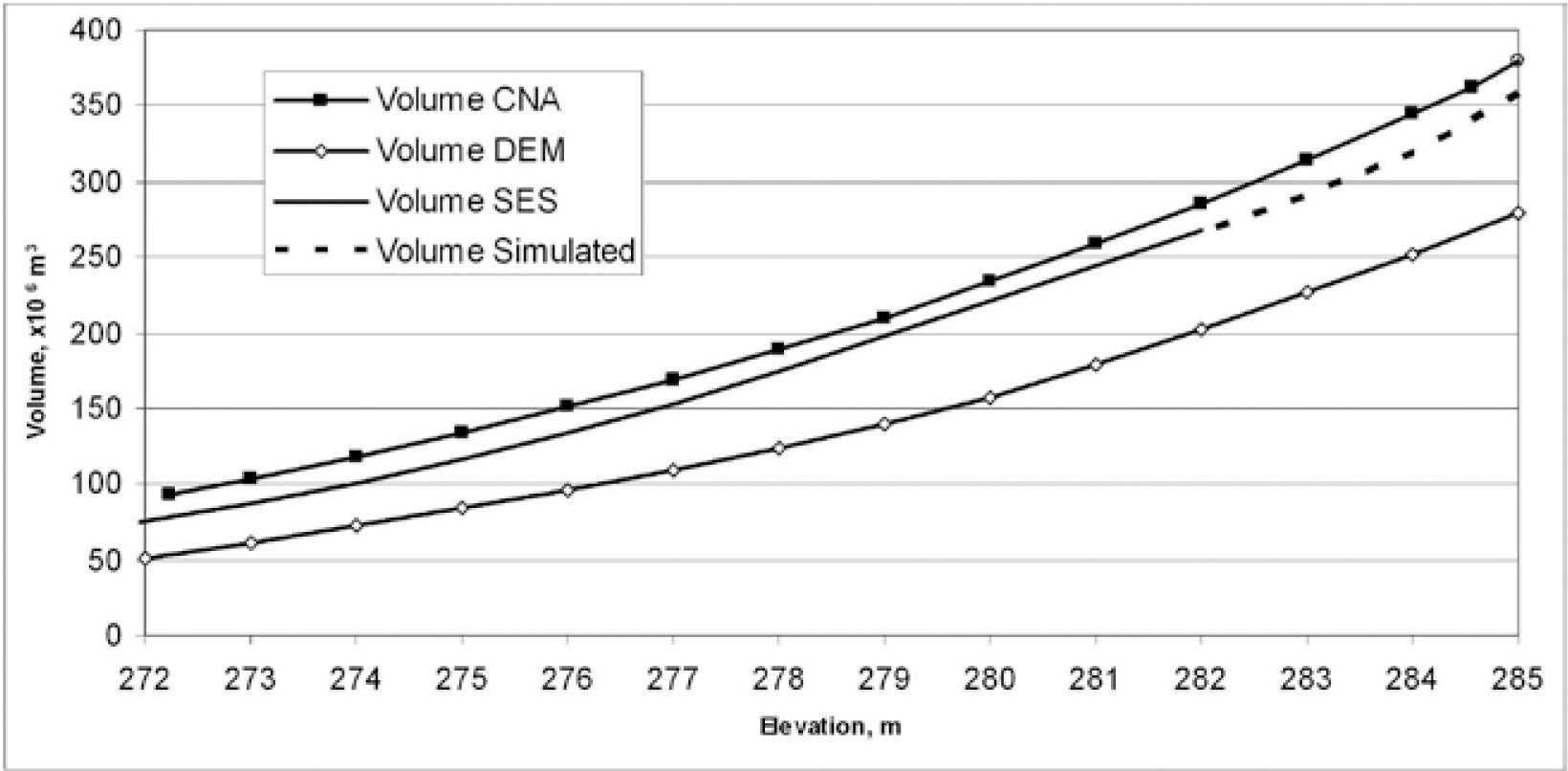 The volume of water, mentioned in the report of CNA, is approximately (12-17)±2millionm3 larger than the amount calculated from the SES data for operation levels 280-275meters respectively (Table 1). This can be explained by recent sedimentation.